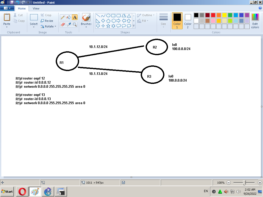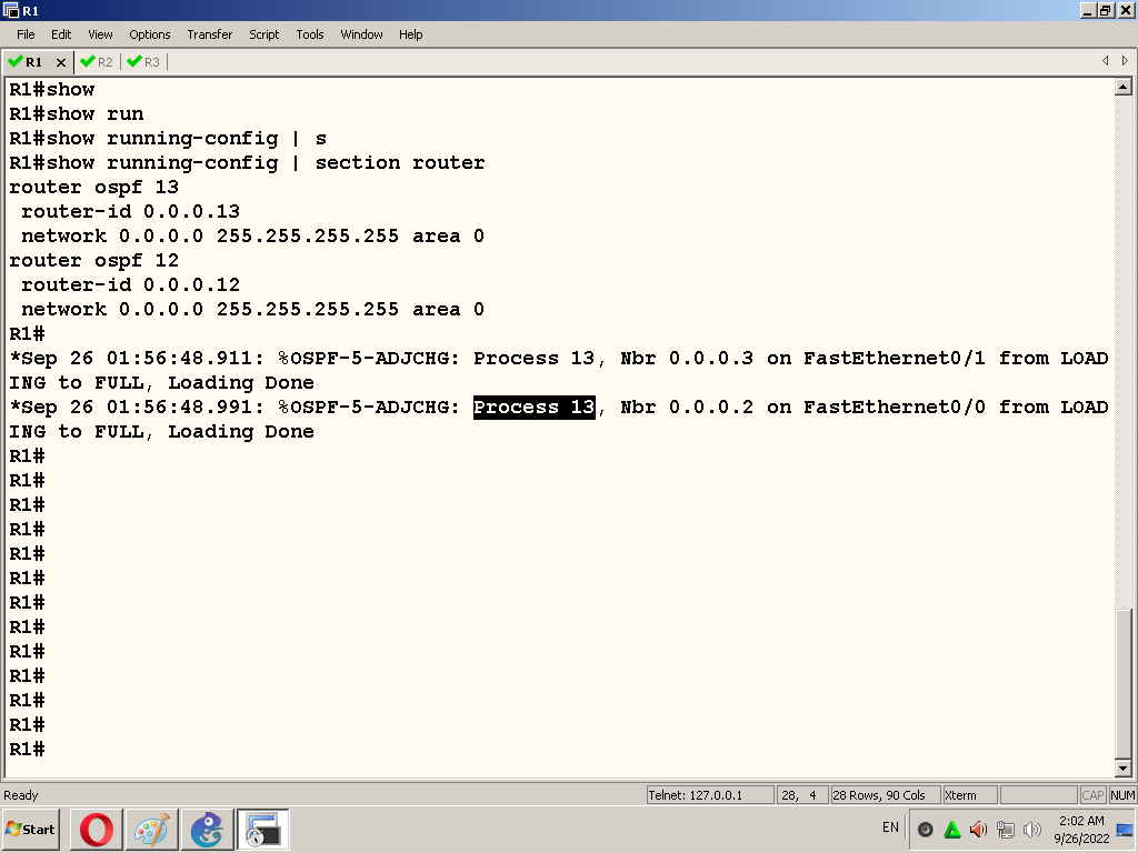 here i have ospf running on R1 with 2 process IDs. why i don`t have on R1 neighbor relationship more than one time for every neighbor ? and why R1 choose PID NO#13 and not select the other PID NO#12 ?